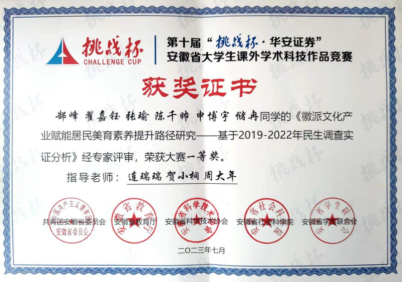 本网讯 近日,共青团中央、中国科协、教育部等主办的第十八届“挑战杯”全国大学生课外学术科技作品竞赛终审决赛在贵州大学圆满落幕,我校公管学院《徽文化产业赋能居民美育素养提升路径研究》项目团队荣获全国三等奖。