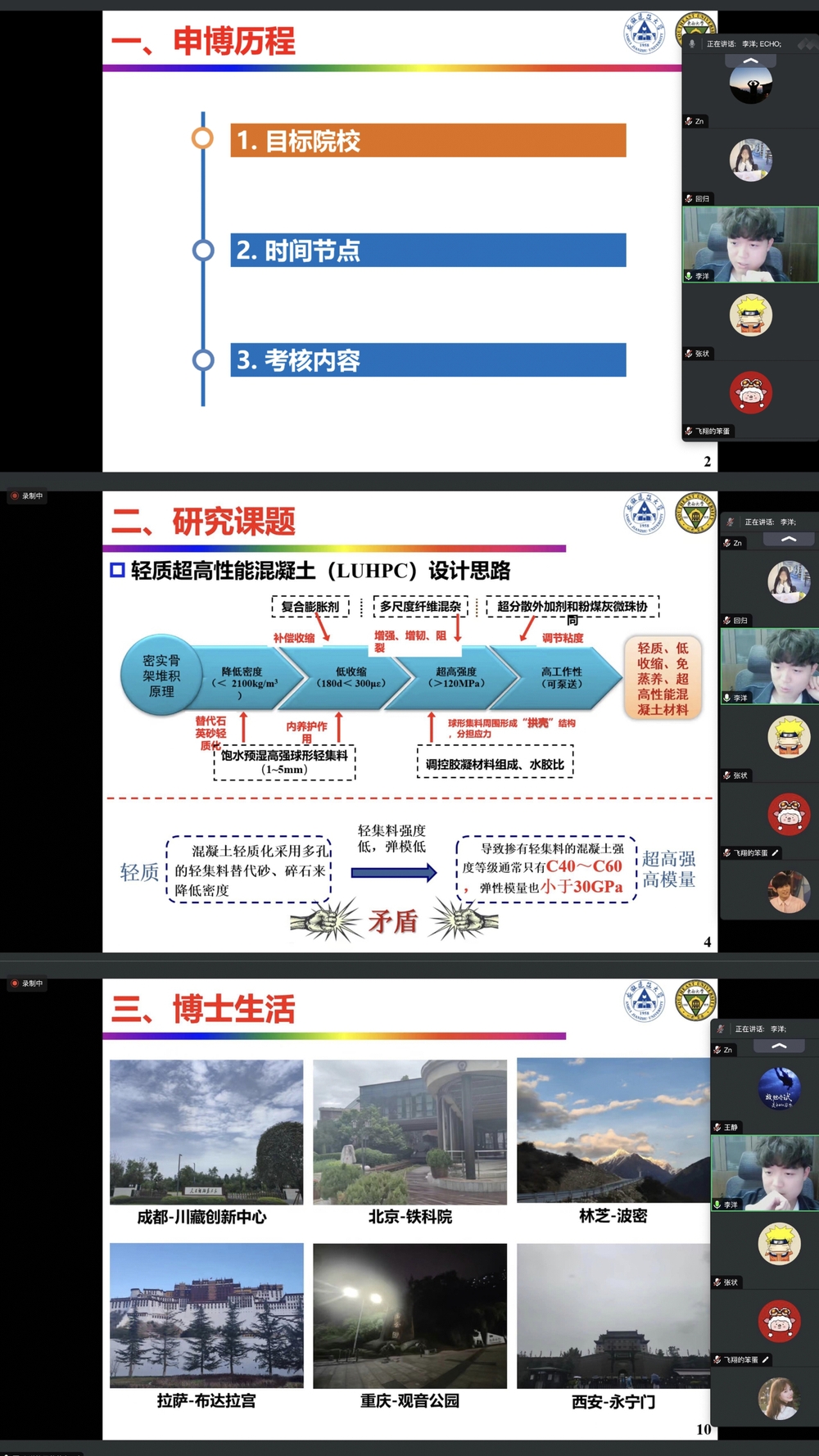 他们向参加分享会的研究生们深入分享了考博的心路历程与学术心得。李洋同学从目标院校、时间节点和考核内容三方面为我们分享了他的申博经历,并介绍了他的研究课题:轻质超高性能混凝土(LUHPC),同时和研子们分享了他充实的博士生活;王静同学首先分享了读博期间的一些心得感悟,之后为我们详细介绍了他的博士研究方向:煤矿瓦斯全生命周期抽采利用相关技术,并展示了在该领域取得的部分成果。