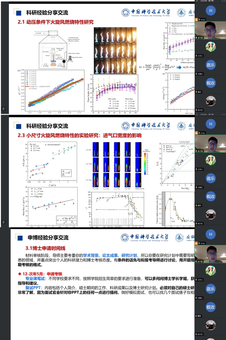 晏子健同学的研究领域是安全科学与工程,研究方向是森林火灾。他为大家着重介绍了自己的科研成果和申博经验。晏子健博士首先为大家讲解了自己研究领域相关的内容——动压条件下火旋风燃烧特性研究,随后展示了为研究生们制定的一份时间规划表。工欲善其事,必先利其器,在讲座的最后,晏子健博士为大家详尽分享了多个便捷的文献阅读软件、图表绘制软件、论文写作软件。