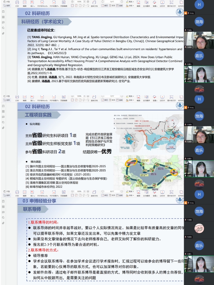 代萌萌同学是建筑学专业,她分析了建筑学不同研究方向的影响,详尽分享了自己的科研和申博的经历,为大家系统介绍了文献整理软件的异同和优劣,并推荐了如何综合考量是否要攻读博士的方法。汤晶晶同学的研究方向是城乡规划信息技术,她为大家详尽分享了自己主持或参加的多个纵向和横向课题,细细梳理了申博所需的材料以及撰写要点,为大家提供了宝贵的经验。
